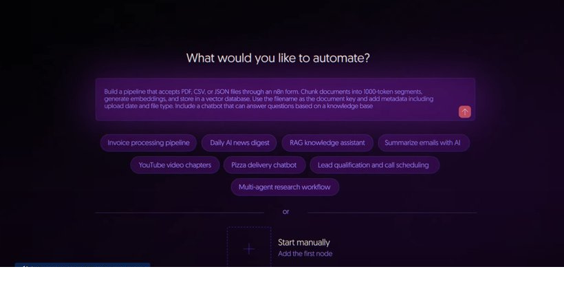 הקסם מתחיל עם פרומפט טקסטואלי. אתם כותבים בשפה טבעית מה הייתם רוצים שהאוטומציה תעשה – לדוגמה, “בנה צינור נתונים שיקבל קבצי PDF, CSV או JSON דרך טופס n8n. צור הטמעות ואחסן במסד נתונים וקטורי…”. ואז, בתוך שניות, ה-AI מגיב עם תרשים זרימה מוגמר למחצה, המורכב מבלוקים (nodes) וחיבורים הגיוניים, המייצגים את השלבים השונים באוטומציה.
