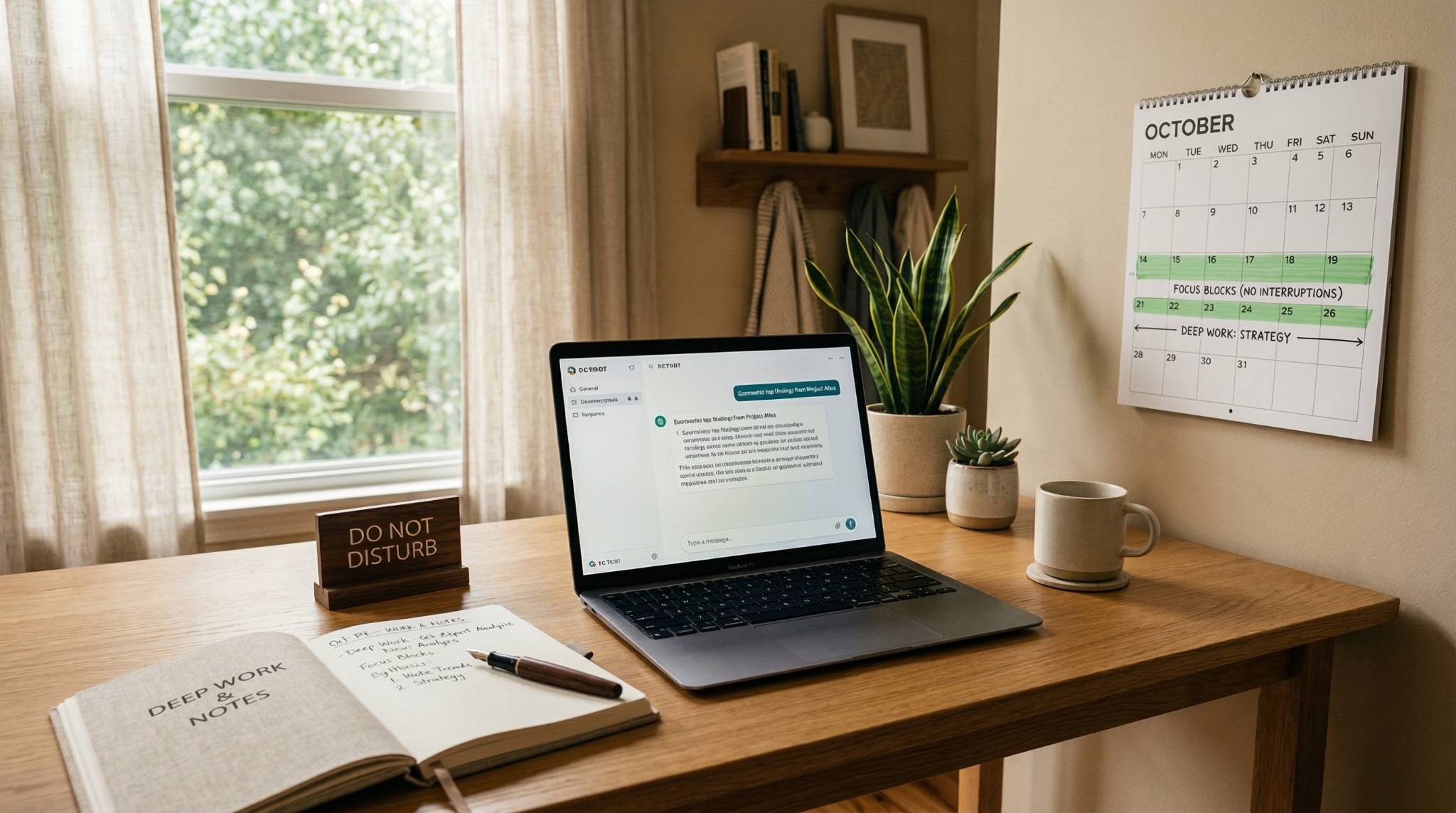 במקום להשתמש ב-AI בצורה מתמשכת לאורך כל היום, הקצו חלונות זמן ספציפיים. למשל: עבודה עם AI בין 9:00 ל-10:30 בבוקר ובין 14:00 ל-15:00 אחר הצהריים. זה מצמצם את מעברי המשימות ונותן למוח מרחב להתאושש.