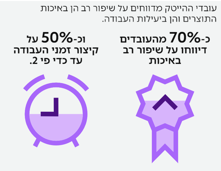 העובדים מדווחים על תרומה ברורה של כלי הבינה המלאכותית לעבודתם. 70% מציינים שיפור רב באיכות התוצרים, ו-50% מדווחים על קיצור משמעותי בזמן ביצוע המשימות. בתוך קבוצת המשתמשים החווים חיסכון בזמן, כ-40% מציינים שהכלים קיצרו עבורם יותר ממחצית מזמן העבודה על משימות מסוימות.