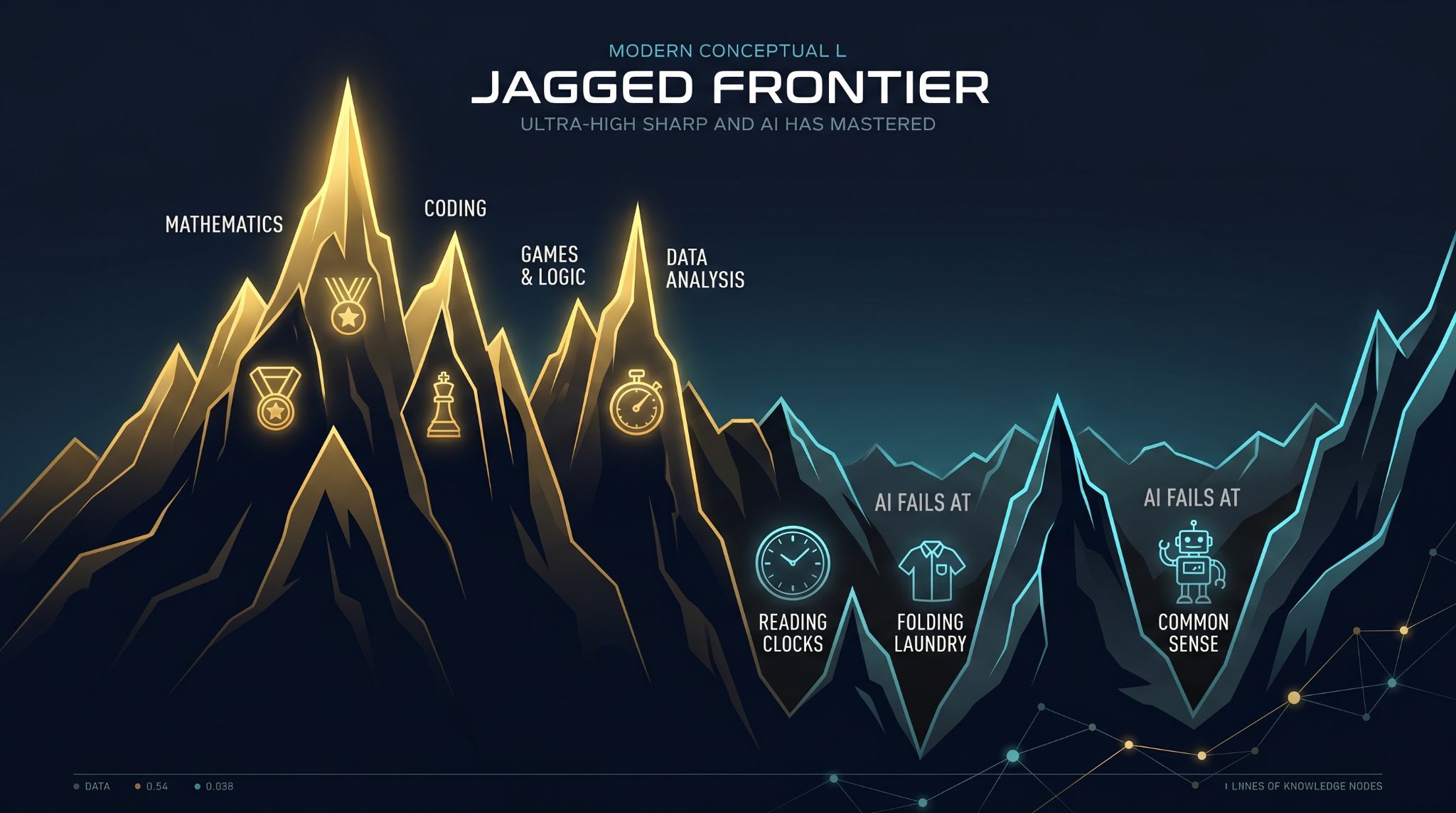 ראשון, תופעה שהחוקרים קוראים לה "החזית המשוננת". דגם Gemini Deep Think זכה במדליית זהב באולימפיאדה הבינלאומית למתמטיקה. באותה שנה, הדגם המוביל בעולם קורא שעון אנלוגי נכון רק ב-50.1 אחוז מהמקרים. רובוטים מצליחים ב-89.4 אחוז מהמשימות בסימולציות מעבדה, אבל רק ב-12 אחוז ממשימות משק בית אמיתיות. יש לנו טכנולוגיה שפותרת בעיות דוקטורט בפיזיקה אבל לא יודעת לקפל חולצה.
