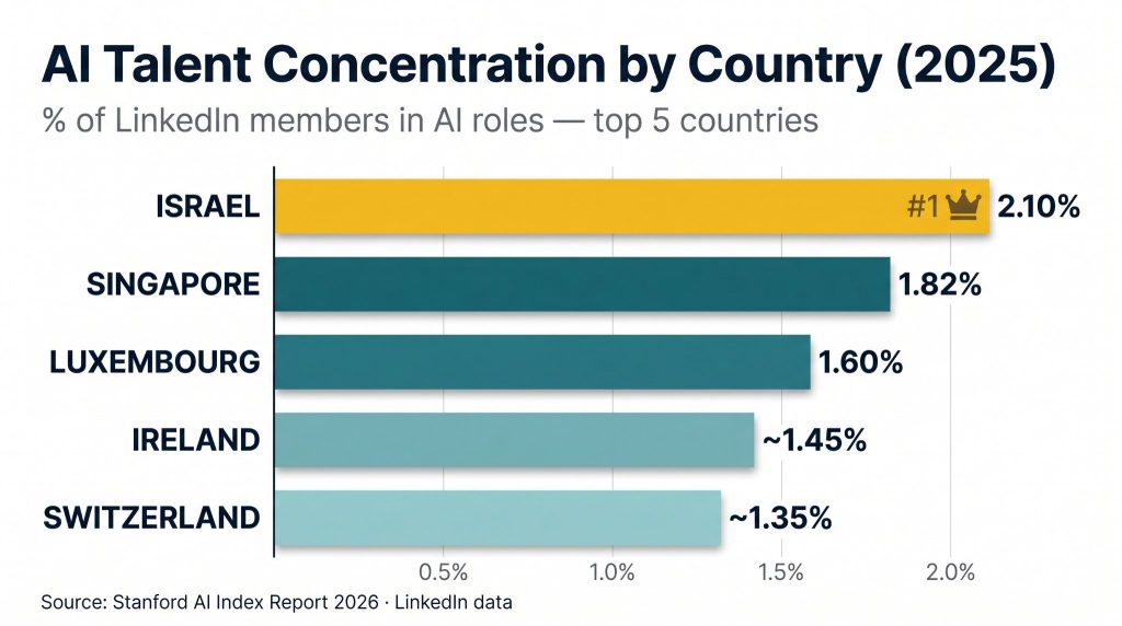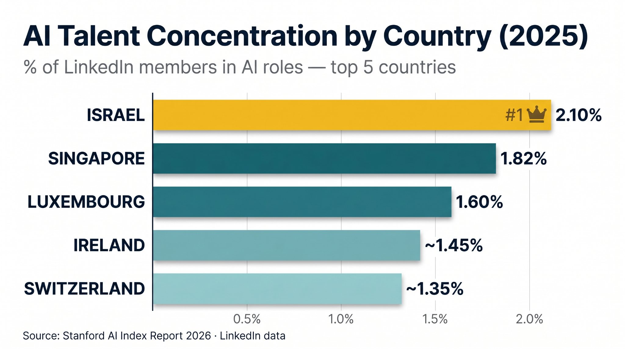 על פי הדוח, ישראל היא המדינה עם ריכוז מומחי ה-AI הגבוה בעולם. 2.1 אחוז מחברי לינקדאין בישראל עובדים בתחום הבינה המלאכותית. אחריה מגיעות סינגפור (1.82 אחוז) ולוקסמבורג (1.60 אחוז). ישראל לא במקום השני או השלישי. היא במקום הראשון.