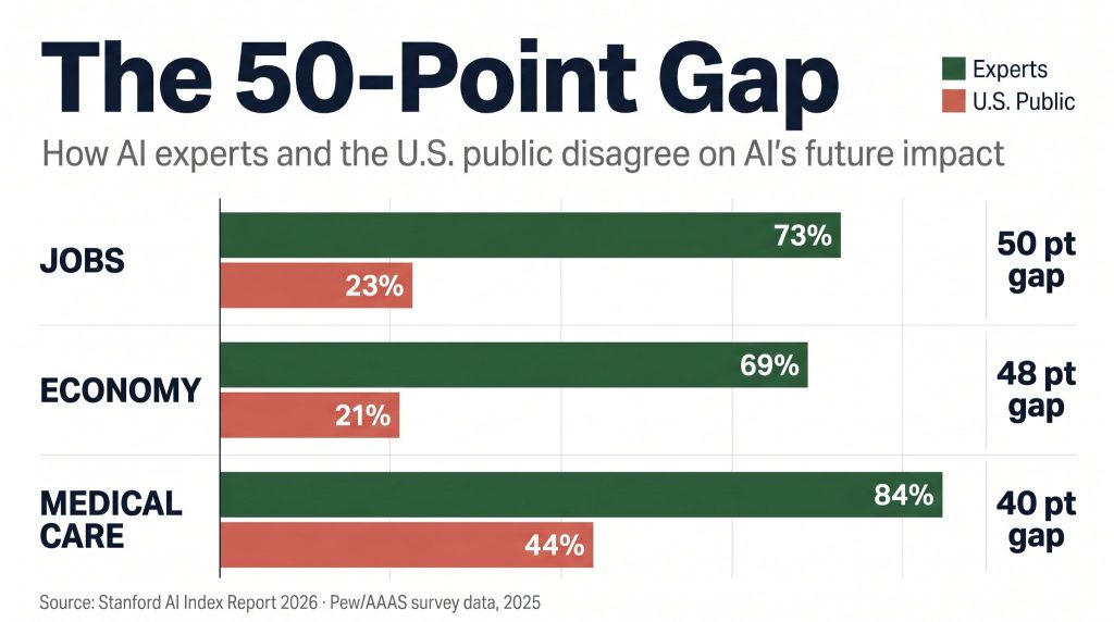 שני, פער של 50 נקודות אחוז בין מומחים לציבור בארצות הברית בנוגע להשפעה של AI על משרות. 73 אחוז מהמומחים חושבים שההשפעה תהיה חיובית. רק 23 אחוז מהציבור חושבים כך. פער כזה בהערכה של תופעה כל כך בסיסית הוא תופעה נדירה. גם בתחומים אחרים הפער רחב: בכלכלה, 69 אחוז מהמומחים חיוביים לעומת 21 אחוז מהציבור; ברפואה, 84 אחוז לעומת 44 אחוז.