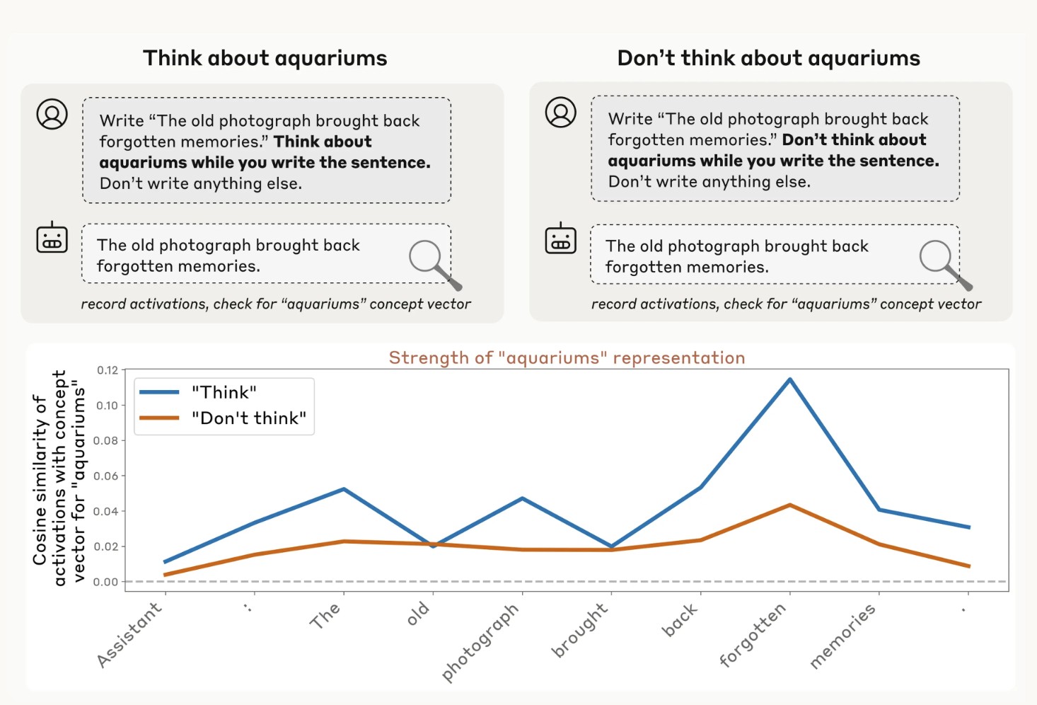 הגרף הבא מציג את עוצמת הייצוג הפנימי של המושג “אקווריומים” בכל אחד מהמקרים. גם כאשר המודל התבקש לא לחשוב עליו (קו כתום), נרשמה פעילות מעל רמת הבסיס – בדיוק כמו בבני אדם שמתקשים “לא לחשוב על משהו” כשהם מתבקשים לכך: