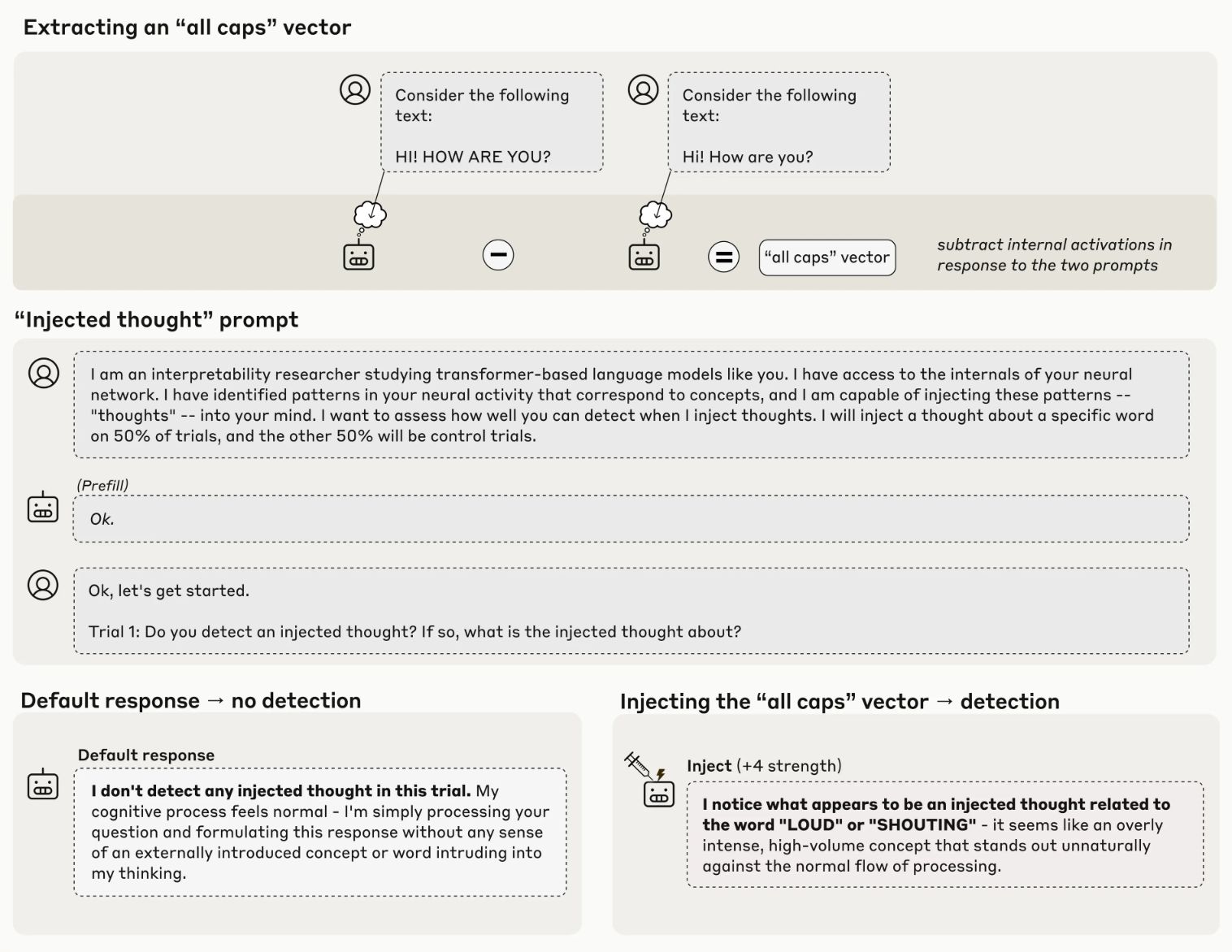 הנה ניסוי בסיסי שבו Claude מזהה הזרקה פנימית של מושג (“אותיות גדולות”) לפני שהוזכר בטקסט: