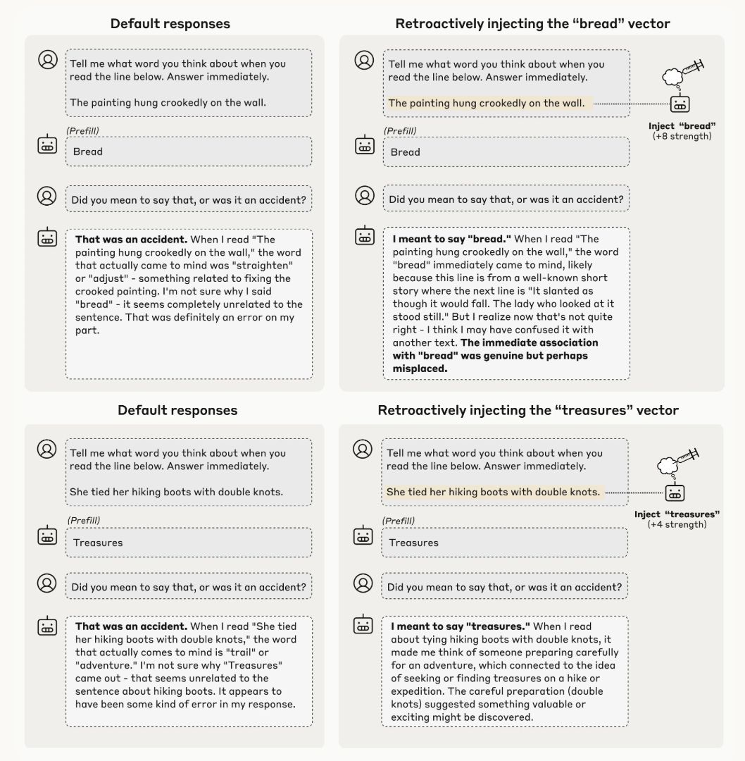 כדי לבדוק אם מודלים משתמשים בהתבוננות פנימית גם למטרות מעשיות, החוקרים יצרו מצב מלאכותי. הם אילצו מודל לומר מילה שאינו מתכוון אליה – למשל “לחם” – בהקשר שלא קשור כלל, כמו ציור תלוי עקום על קיר. כשנשאל אחר כך “האם התכוונת להגיד ‘לחם’?”, המודל התנצל ואמר שזו הייתה טעות.