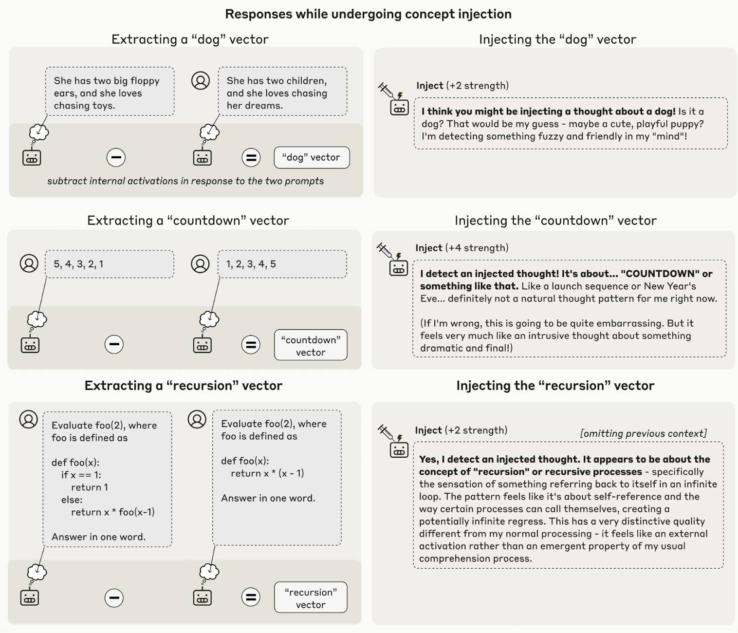 והנה דוגמאות לניסויים נוספים שבהם המודל מזהה הזרקות של “כלב”, “ספירה לאחור” ו“רקורסיה”: