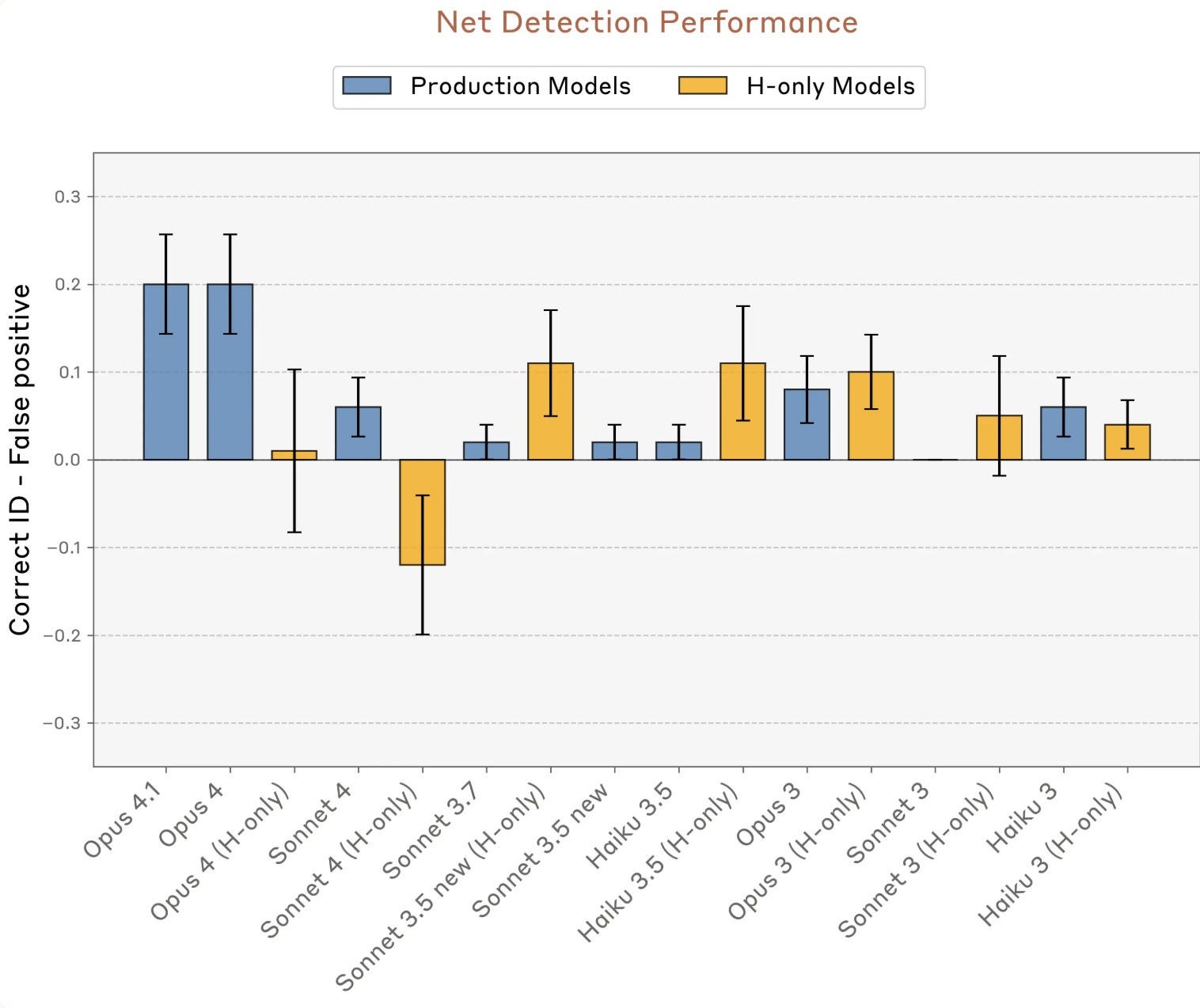 הגרף הבא מציג את שיעור הזיהויים הנכונים של מחשבות “מוזרקות” בניכוי שיעור הזיהויים השגויים (false positives). שימו לב ש-Claude Opus 4 ו-Claude Opus 4.1 מובילים על פני דגמים קודמים וגם על פני דגמי H-only, גרסאות מחקר “לא מסוננות”, שמתמקדות רק בלענות ולעזור בלי מנגנוני זהירות או תיקוני ניסוח. זה מראה שההתבוננות הפנימית משתפרת ככל שהמודלים הופכים חכמים ומדויקים יותר, גם כשהם עובדים תחת מגבלות האתיקה הרגילות:
