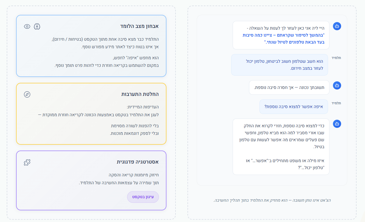 במהלך השיעור עצמו, לכל תלמיד יש מרחב לגיטימי לשאול, להתייעץ ולהיתקע. דרך עוזר אישי בצ’אט הוא מקבל מענה לשאלות הפדגוגיות השכיחות: איך ניגשים לשאלה, מה מחפשים בטקסט, למה השאלה מתכוונת ואיך מפרקים בעיה מורכבת לשלבים.