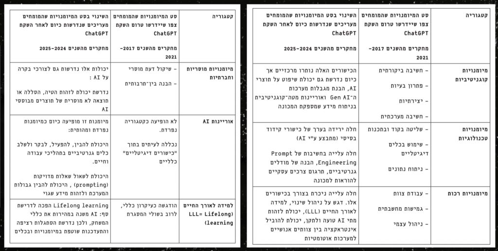 הטבלה הבאה, שפורסמה בטיוטת דיון של המכון הישראלי לדמוקרטיה, מבוססת על סקירת מחקרים מקיפה שבחנה את השינויים בכישורים הנדרשים בשוק העבודה מאז השקת ChatGPT. היא מציגה השוואה שיטתית בין תחזיות מ-2017–2021 לבין דרישות מעודכנות לשנים 2024–2025, על פני ארבע קטגוריות: אוריינות AI, מיומנויות רכות, כישורים טכנולוגיים ומיומנויות קוגניטיביות.