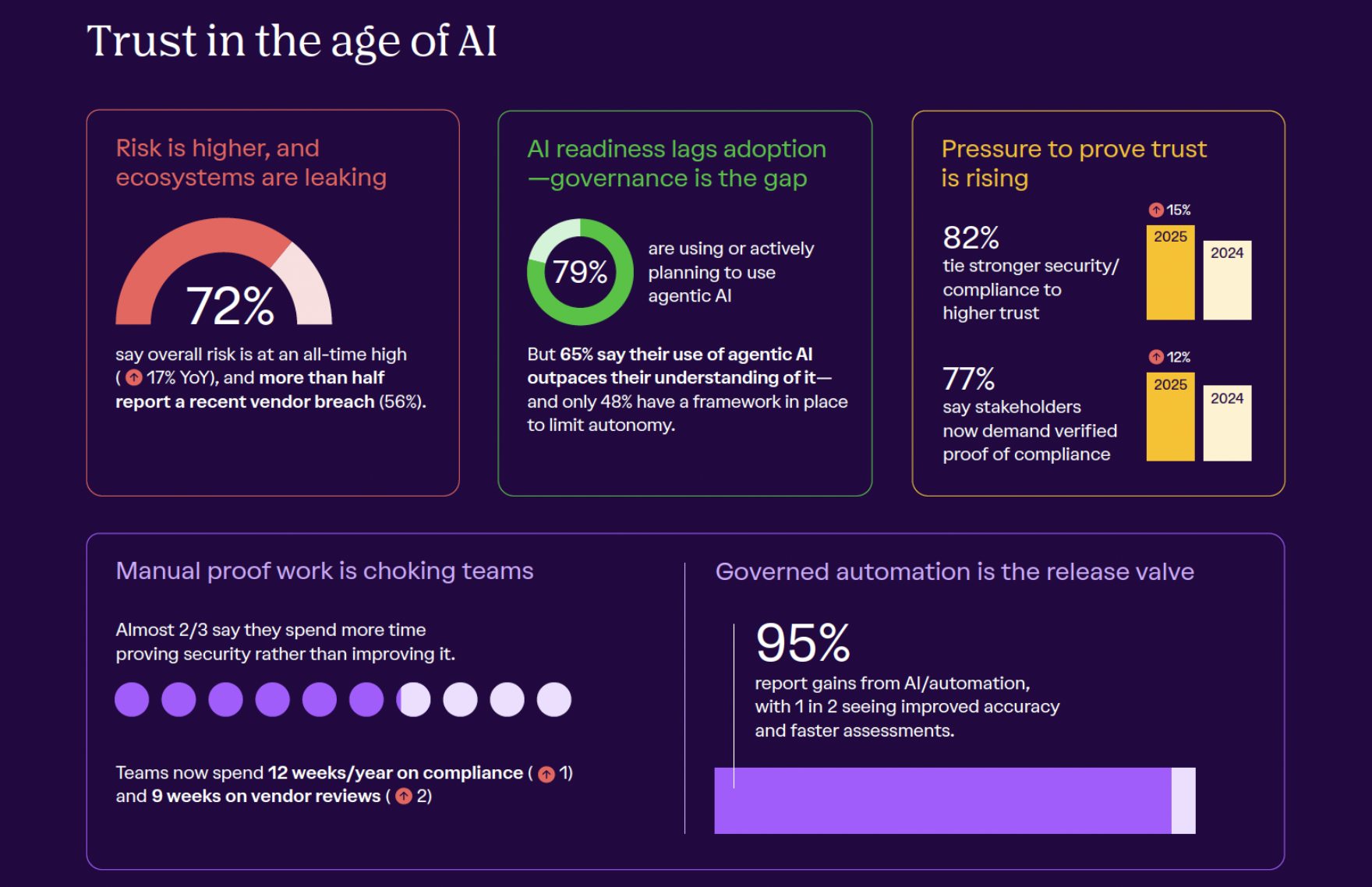 המחקר הזה מצייר תמונה ברורה: עולם האבטחה והאמון עובר מהפכה. ארגונים מוצפים באיומים, מוגבלים בתקציבים, ונאלצים להוכיח אמון כל הזמן. צוותי אבטחה שוחקים תחת העומס של קומפליינס ידנית, ורשתות ספקים מלאות בסיכונים.