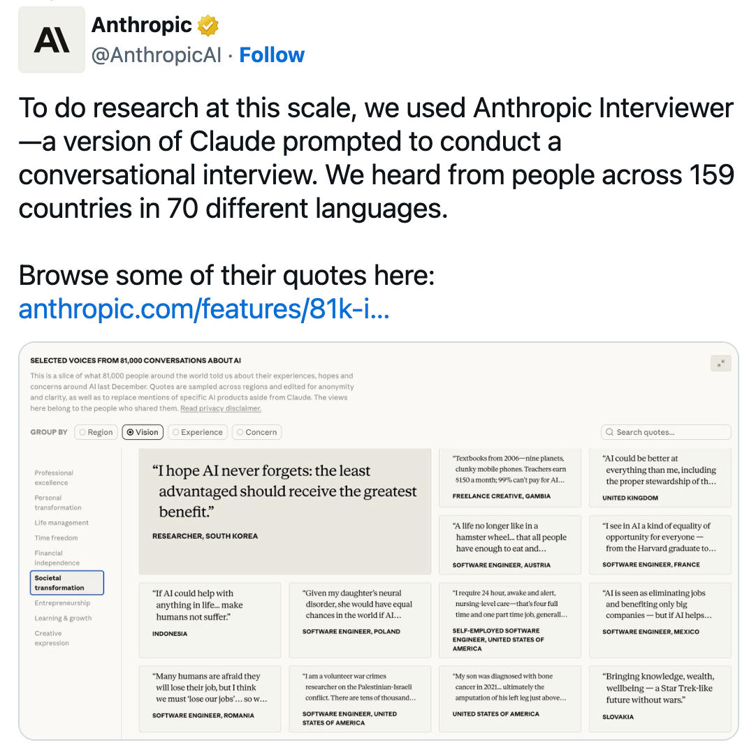 אנטרופיק עשתה משהו שלא נעשה בקנה מידה כזה קודם. במהלך שבוע אחד בדצמבר 2025, גרסה מותאמת של Claude ראיינה 80,508 משתמשים מ-159 מדינות, ב-70 שפות. לא שאלון סגור עם תשובות מוכנות מראש - שיחות אמיתיות של עשר עד חמש עשרה דקות, עם שאלות המשך שהתאימו את עצמן לתשובות. המחקר הונהג על ידי Saffron Huang, חוקרת בצוות ההשפעות החברתיות של אנטרופיק.