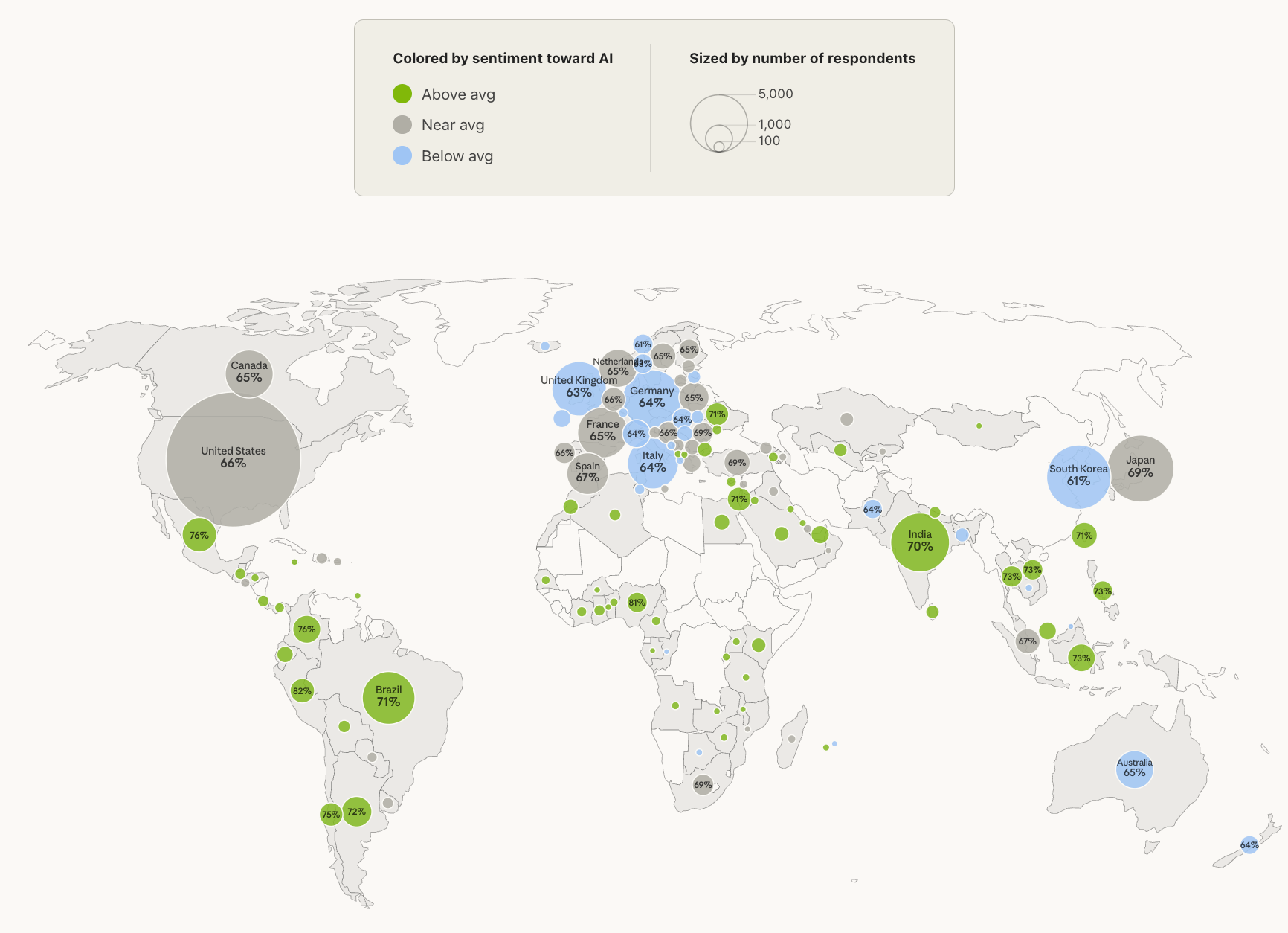 התמונה הגלובלית חושפת פער מפתיע. באפריקה שמדרום לסהרה רק 24.2% הביעו סנטימנט שלילי כלפי AI. במערב אירופה - 35.6%. ככל שהמדינה עשירה יותר, כך האוכלוסייה חרדה יותר. הסיבה לא מופשטת. במדינות מתפתחות, AI מתפקד כ"מנגנון לעקיפת מחסום הון" - כך תיארו את זה משתמשים מאפריקה, דרום אסיה ואמריקה הלטינית. AI נותן גישה לידע, כלים ושירותים שבלעדיו לא היו זמינים.