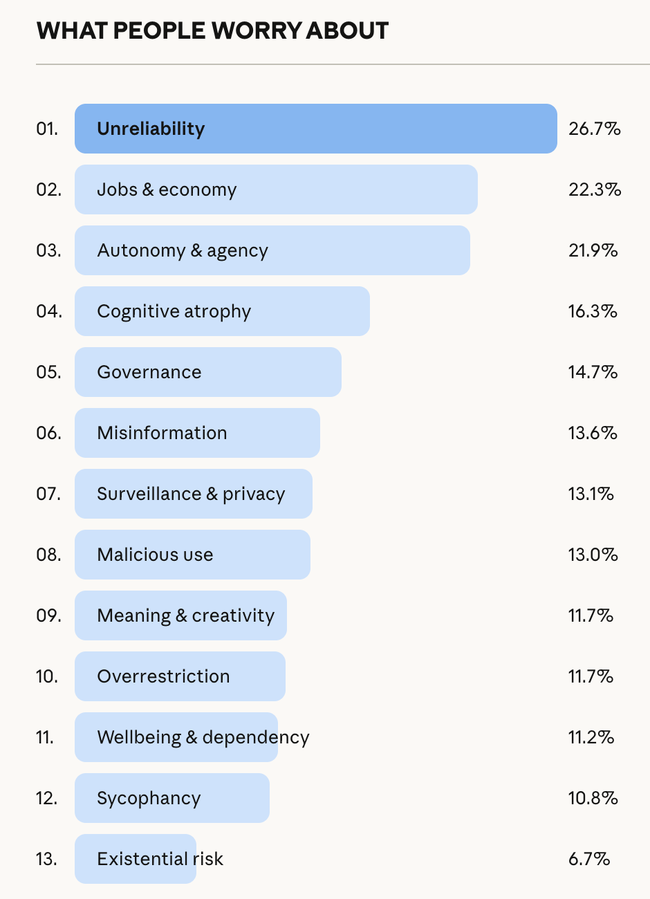 המחקר מערער על תפיסה רווחת. רק 6.7% מהמשתתפים חוששים מסיכון קיומי - אותם תרחישים אפוקליפטיים שתופסים כותרות. הפחדים שבאמת מעסיקים את רוב האנשים הם הרבה יותר קרקעיים: חוסר אמינות (26.7%), עקירה מעבודה (22.3%), ואיבוד היכולת לחשוב באופן עצמאי (21.9%). אלה לא חששות של אנשים שמפחדים מ-AI כי הם לא מכירים אותו. אלה חששות של אנשים שמשתמשים בו כל יום ויודעים בדיוק איפה הוא נכשל.