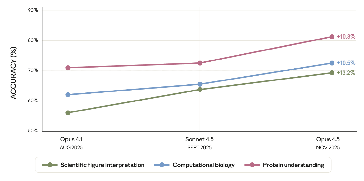 בגרף המצורף תראו איך קלוד משתפר כל הזמן ולומד לדבר “מדעית”: בתוך שלושה חודשים בלבד, קלוד Opus 4.5 רשם זינוק של מעל 13% ביכולת לפענח איורים מדעיים ושיפור של יותר מ-10% בהבנת מבני חלבונים – יכולות המקצרות משמעותית את זמן המחקר והפיתוח: