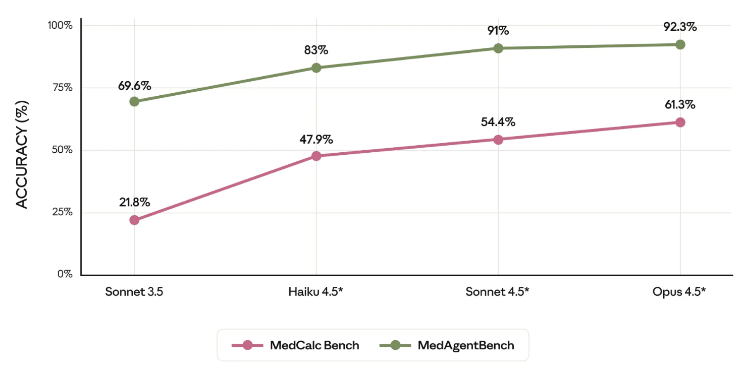 בגרף המצורף רואים איך קלוד עובר משיחה לביצוע משימות ואת הביצועים של קלוד Opus 4.5 במדדי הסוכן והחישוב הרפואיים. רמת הדיוק של 92.3% במדד ה-MedAgentBench מוכיחה שהמודל מוכן לבצע תהליכי עבודה רפואיים מורכבים ברמת אמינות גבוהה ביותר: