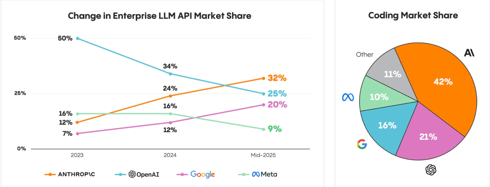 הנה תרשים שמדגים את נתחי השוק המעודכנים של ספקיות LLM בשוק הארגוני ובתחום הפיתוח: