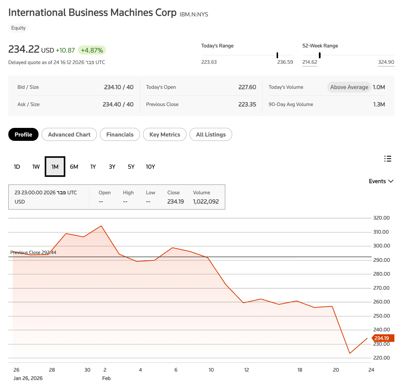 הנה גרף מניית IBM במהלך פברואר 2026. ירידה של כמעט 60 דולר בתוך חודש, כולל נפילה חדה סביב 20 בפברואר: