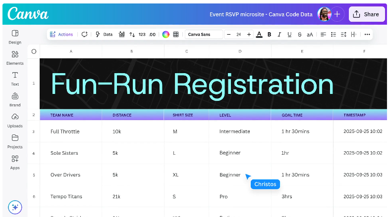 כעת ניתן לשלב בין Canva Code ו-Canva Sheets ליצירת חוויות אינטראקטיביות מבוססות נתונים. כך כל תשובה בטופס או הזמנה נרשמת ישירות בגיליון ומתחברת לעיצוב דינמי. בנוסף, ניתן לעצב כל רכיב בקוד ישירות מתוך העורך של Canva, לפרסם בלחיצה אחת כאתר עצמאי – עם כתובת ייחודית.