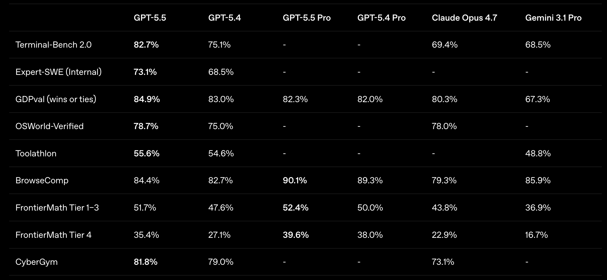 השוואת ביצועים רוחבית: GPT‑5.5 מוביל ברוב הקטגוריות, אך לא בכולן | OpenAI