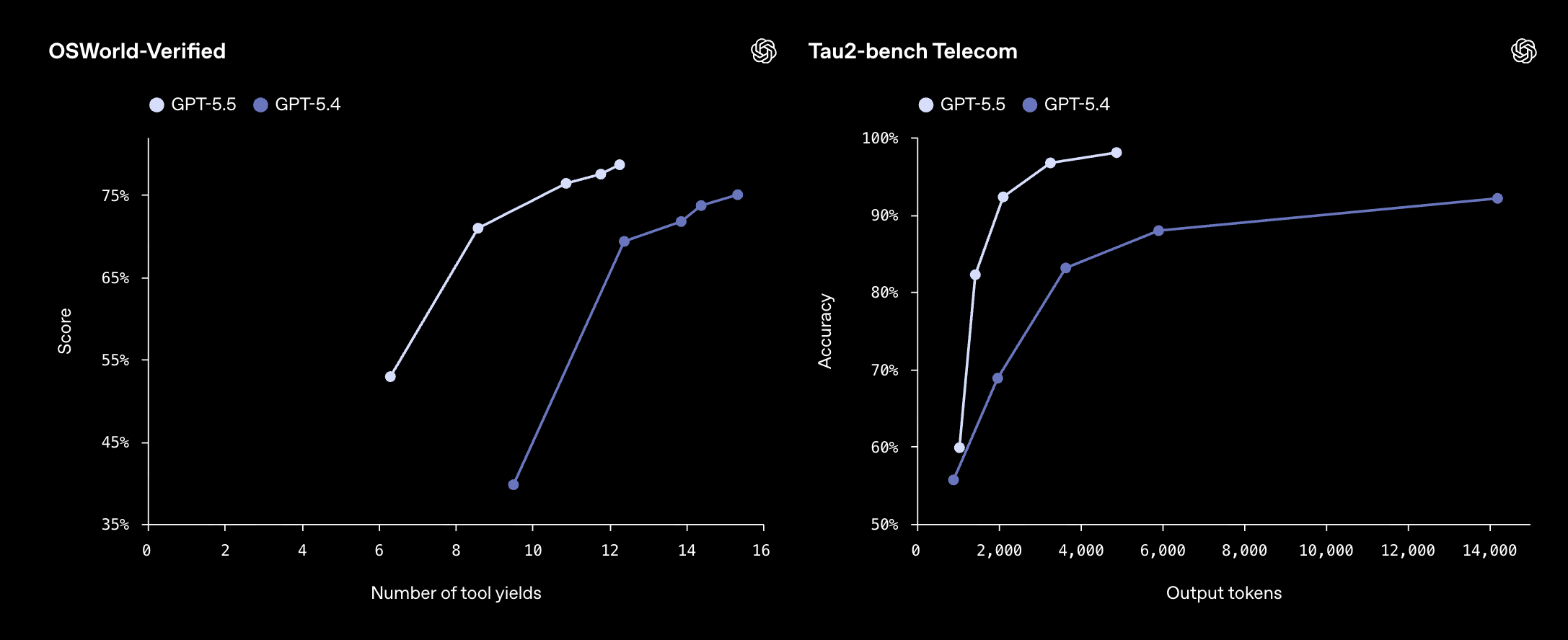 הגרף המצורף מציג בצורה ברורה את השדרוג המשמעותי הזה. לא רק שהוא שומר על מהירות זהה לדור הקודם, הוא גם מדויק יותר ויציב יותר במשימות שמדמות שימוש אמיתי במחשב. ב‑OSWorld‑Verified, שמודד יכולת שליטה במחשב, GPT‑5.5 משיג תוצאות גבוהות יותר בכל רמות המורכבות. ב‑Tau2‑bench Telecom, שמודד דיוק במשימות ניתוח טקסט מורכבות, הוא מציג עקביות גבוהה יותר לאורך כל טווח הטוקנים: