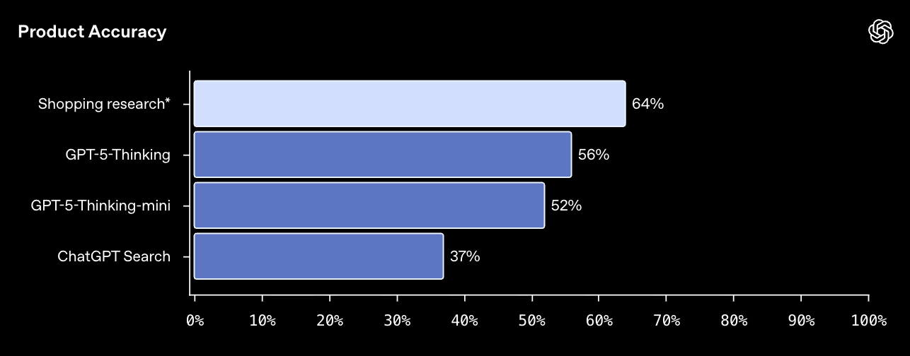 בגרף המצורף אפשר לראות את השיפור שאותו מציגה OpenAI בדיוק התאמת המוצרים לדרישות המשתמש. בבדיקה פנימית, Shopping Research מגיע לדיוק של 64 אחוז בעמידה בתנאים כמו מחיר, צבע, חומר ומפרט. לצורך השוואה, GPT-5 Thinking עומד על 56 אחוז, גרסת המיני על 52 אחוז, והחיפוש הרגיל מגיע ל- 37 אחוז:
