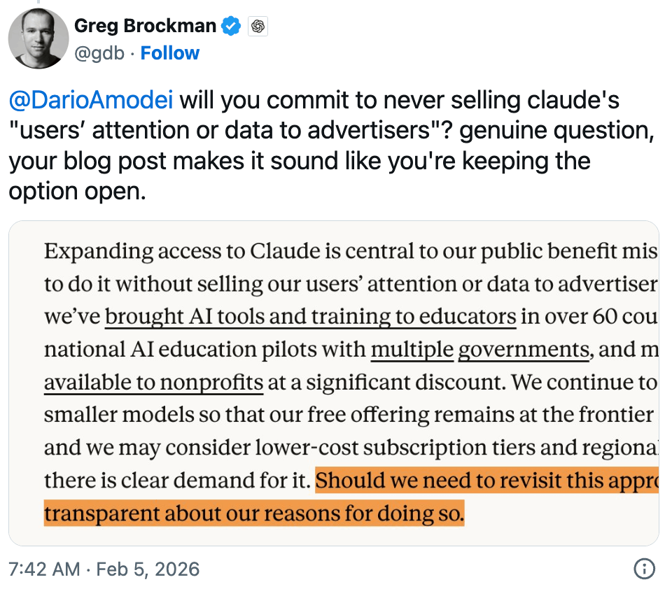 במקביל, גרג ברוקמן, ממייסדי OpenAI, ניסה לסדוק את תדמית ה”טהרנות” של Anthropic. הוא הצביע על סעיף במניפסט שלהם שבו הם מציינים כי אם יצטרכו “לבחון מחדש את הגישה” הם יהיו שקופים לגבי זה. ברוקמן הציב אתגר ישיר למנכ”ל Anthropic, דאריו אמודיי, ותהה ב-X האם הוא מוכן להתחייב באופן מוחלט לעולם לא למכור את תשומת הלב של המשתמשים למפרסמים, או שמא החברה השאירה לעצמה “דלת אחורית” פתוחה לשינוי המודל בעתיד.