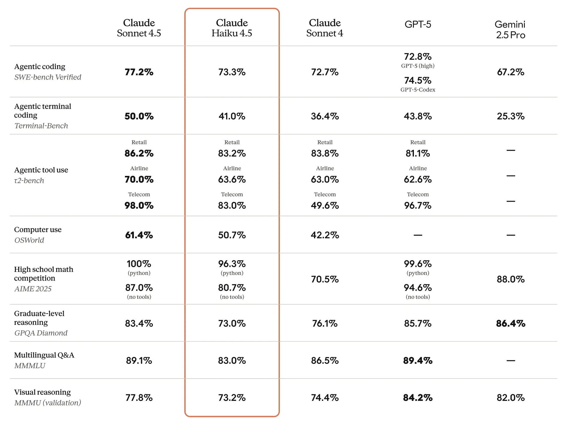 בעולם שבו כל אחוז דיוק נחשב, Claude Haiku 4.5 מצליח להישאר כמעט כתף אל כתף עם מודלים מתקדמים בהרבה, ובמחיר נמוך משמעותית. בהשוואות שביצעה Anthropic, מודל Haiku 4.5 עוקף את Gemini 2.5 Pro ברוב הקטגוריות, שומר על פער זעיר מול GPT-5 בקידוד (73.3% לעומת 74.5%), ומציג תוצאות מרשימות גם במשימות מתמטיות, הבנה ויזואלית ורב-לשוניות.