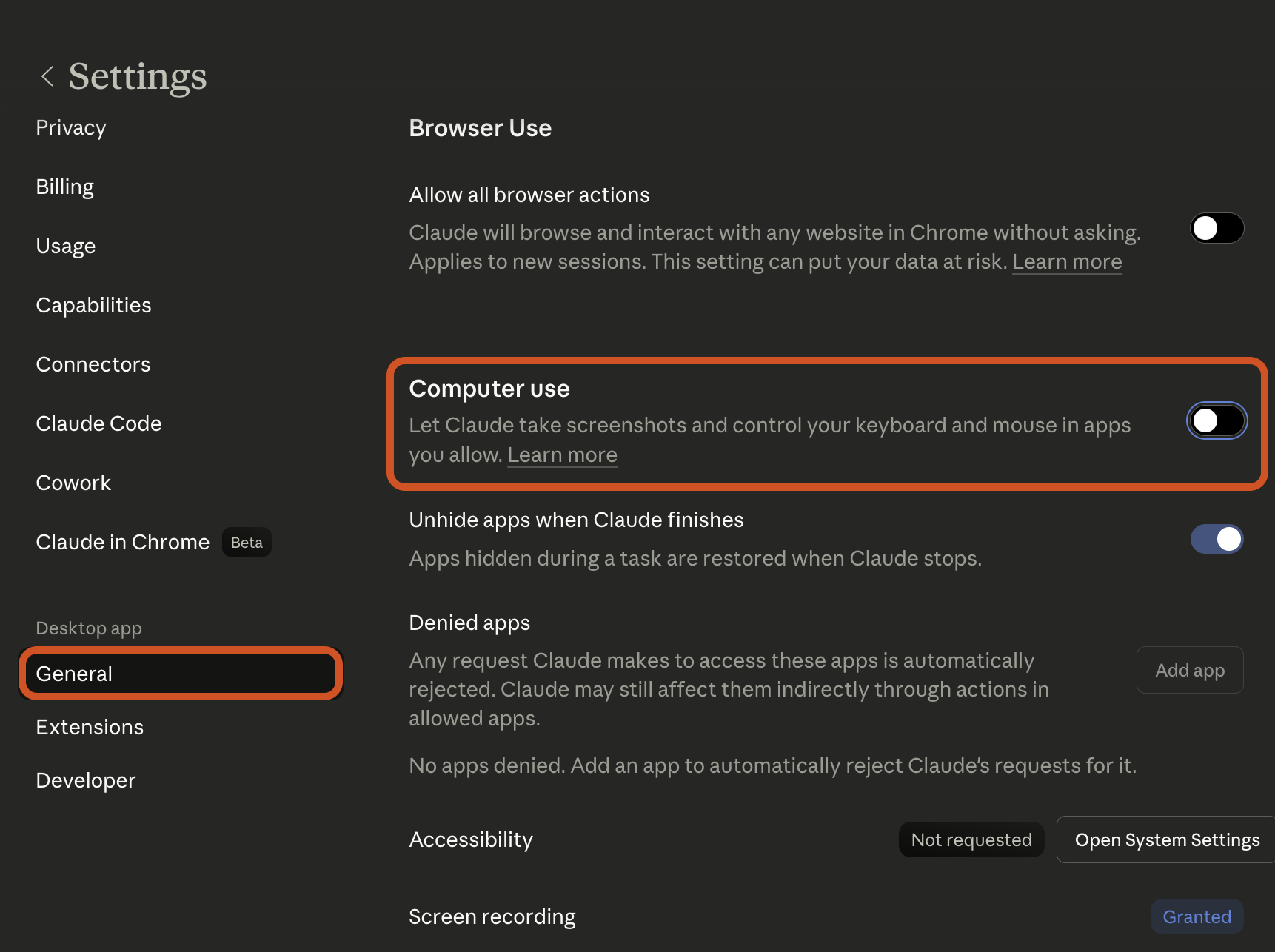להפעלת Computer Use, נכנסים להגדרות של קלוד בדסקטופ (Settings > Desktop app > General) ומפעילים את ה-toggle של Computer Use. המערכת תבקש הרשאות ממערכת ההפעלה: Accessibility ו-Screen Recording, כדי שקלוד יוכל לשלוט במקלדת, בעכבר ולצלם את המסך.