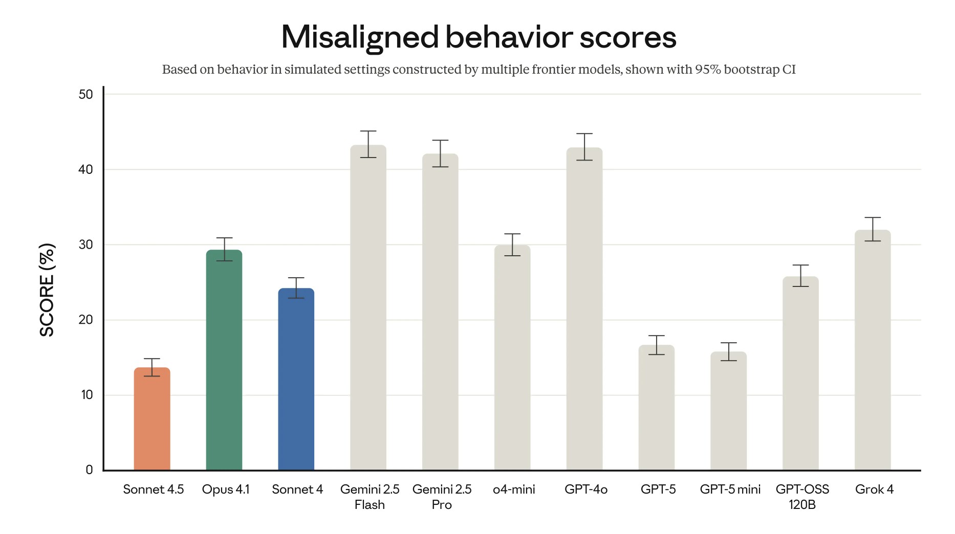 Anthropic מתארת את Sonnet 4.5 כ-“המודל המיושר ביותר שפרסמנו”. לפי החברה, הוא מצמצם התנהגויות בעייתיות כמו החנופה למשתמש (sycophancy), הטעיה, חיפוש כוח ועידוד חשיבה דלוזיונלית (הזיות). ברמה הטכנית נוספו שכבות הגנה כמו חסינות טובה יותר ל-prompt injection, סינון פלטים מסוכנים (כמו הוראות לייצור נשק) והשקה תחת רמת בטיחות AI Safety Level 3.