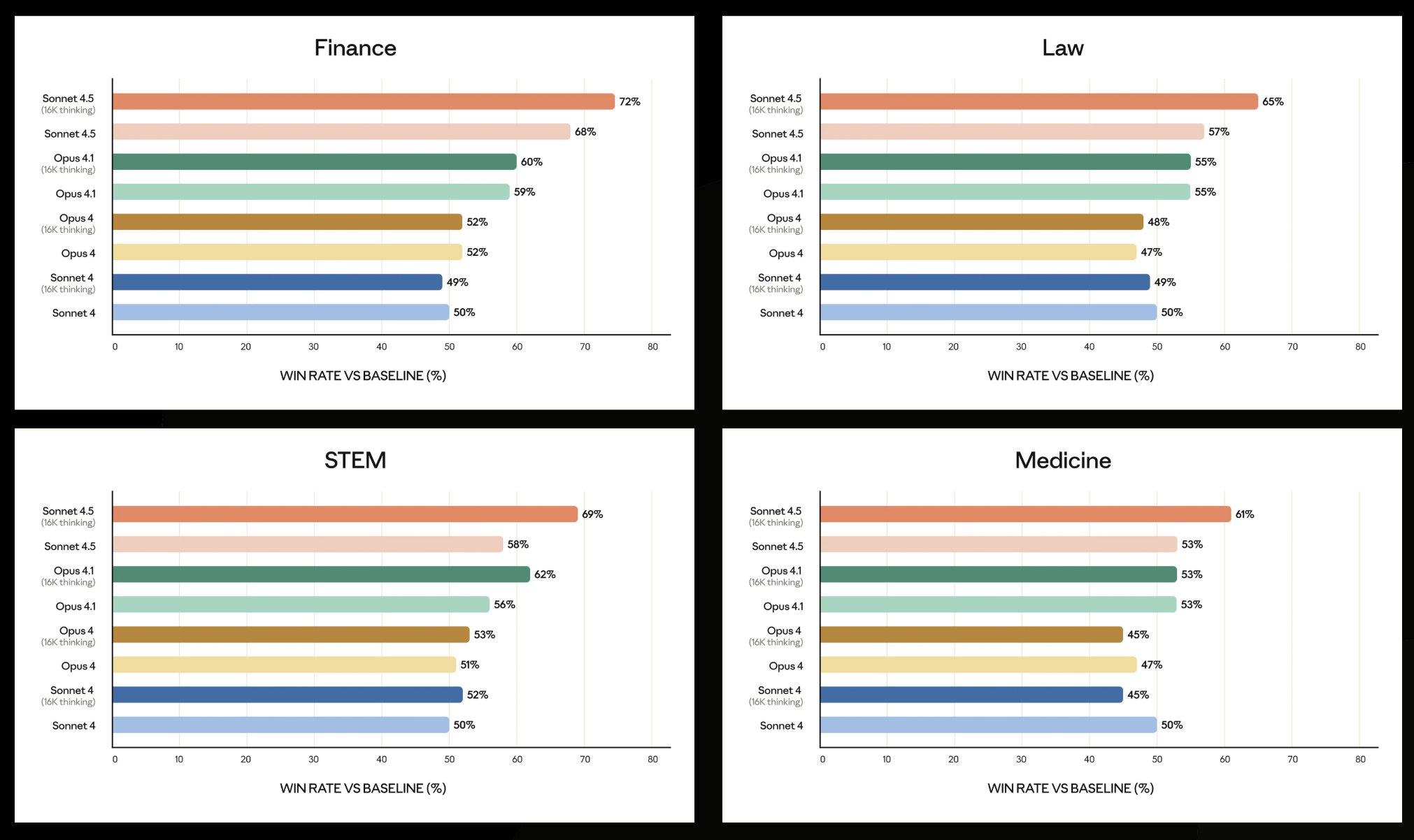 וזה לא נגמר בקוד. בבדיקות יישומיות בתחומי פיננסים, משפט, רפואה ומדעים, Sonnet 4.5 מציג יתרון מובהק על פני דורות קודמים – גם במשימות חשיבה מורכבות (‘16k thinking’) וגם בביצוע יומיומי.