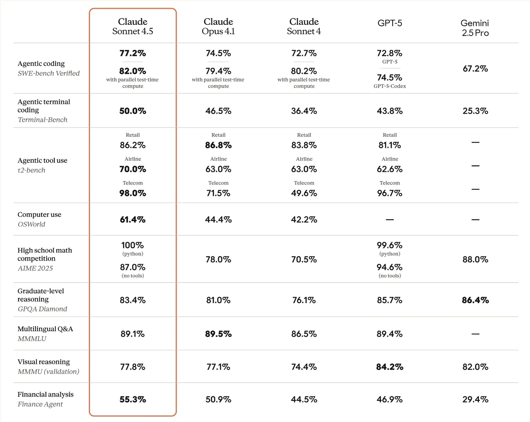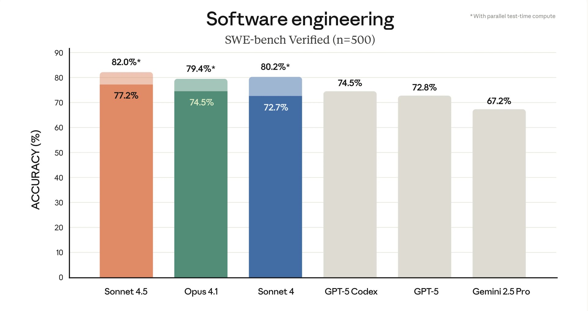 כאן אין מקום לשיווק, רק למספרים. במבחן SWE-bench Verified, שבודק אם מודל מסוגל לפתור באגים אמיתיים מגיטהאב, Sonnet 4.5 מוביל עם 77.2% (ואפילו 82% כשמפעילים parallel test-time compute). הוא עקף גם את GPT-5 וגם את Gemini.