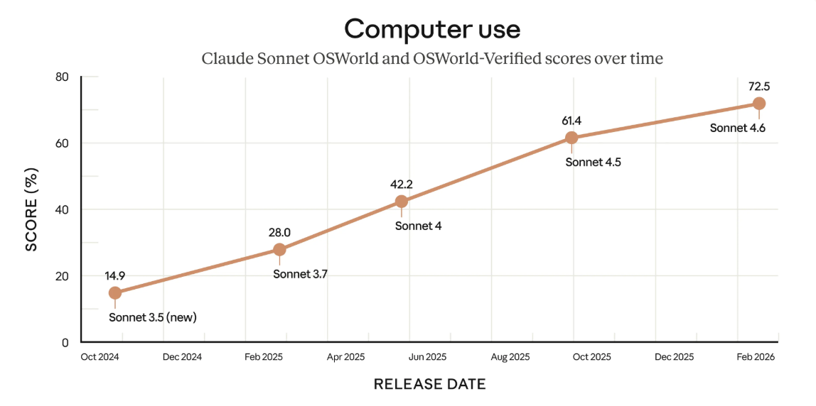אחד התחומים שבהם Sonnet 4.6 מציג את הקפיצה הגדולה ביותר הוא שימוש במחשב. מאז שאנטרופיק הציגה לראשונה מודל כללי לשימוש במחשב באוקטובר 2024, מודל שתואר אז כ”עדיין ניסיוני, לעיתים מסורבל ושגוי”, חל שיפור עקבי ומשמעותי. תקן הביצועים OSWorld מציג זאת בצורה ברורה – Sonnet 4.6 מגיע ל-72.5 אחוז ב‑OSWorld‑Verified, לעומת 61.4 אחוז ב‑Sonnet 4.5 ו‑42.2 אחוז ב‑Sonnet 4.0.