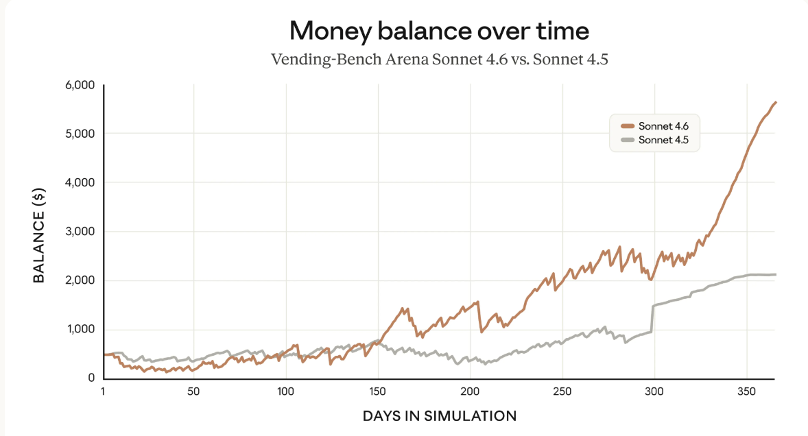 היכולת הזו בלטה במיוחד במבחן Vending‑Bench Arena, המדמה ניהול עסק לאורך זמן. Sonnet 4.6 אימץ אסטרטגיה יוצאת דופן, שבמסגרתה השקיע משאבים רבים בחודשים הראשונים ולאחר מכן עבר למיקוד חד במקסום רווחים. התזמון המדויק של המהלך העניק לו יתרון משמעותי, והוא סיים את הסימולציה הרבה לפני המתחרים. הגרף למעלה ממחיש זאת היטב: Sonnet 4.6 מגיע לכ‑6000 דולר בסוף התקופה, בעוד Sonnet 4.5 נע סביב 3000 דולר בלבד.