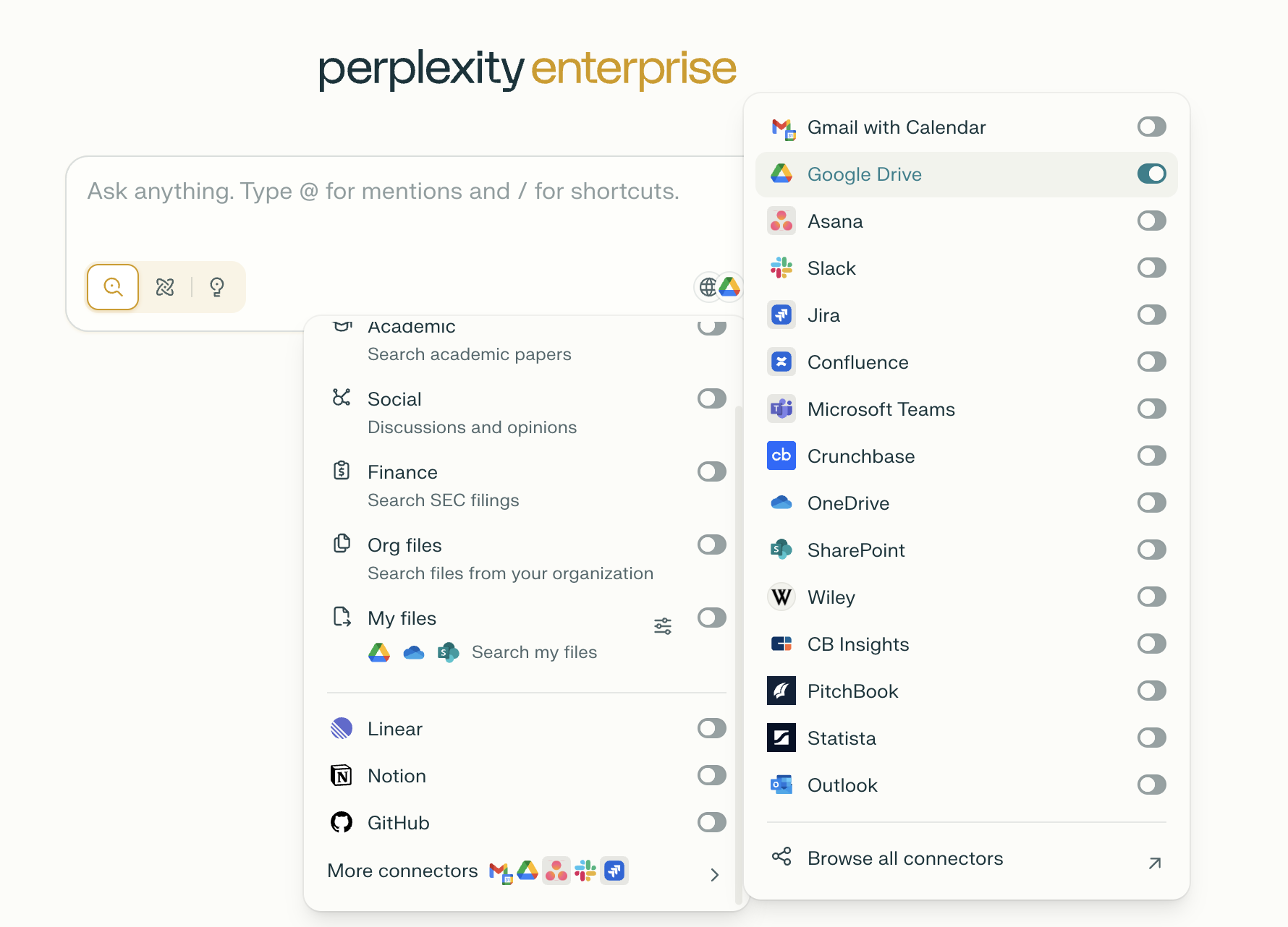 כאשר Google Drive Connector מופעל, פרפלקסיטי יכול לבצע שני סוגי חיפוש שונים, שלכל אחד מהם יש היגיון ושימושים ייחודיים.