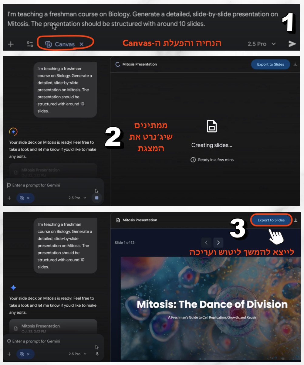 לאחר ש-Gemini Canvas יוצר את המצגת הראשונית, ניתן לבדוק אותה ולעשות עריכות בתוכן ובעיצוב. קיימת אפשרות יצוא ל-Google Slides לעריכה חופשית, הוספת אלמנטים עיצוביים או התאמה למיתוג הארגוני.