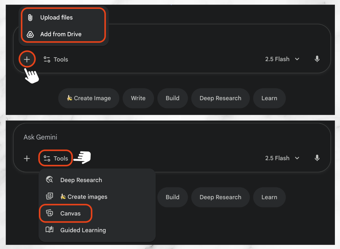 בשלב הבא נכנסים לפלטפורמת Gemini ובוחרים בממשק Canvas – סביבת העבודה האינטראקטיבית של גוגל. שם ניתן להעלות את הקובץ הרצוי ישירות לחלון הייעודי. מרגע שהקובץ נטען, Canvas מזהה את מבנה הטקסט ומכין אותו לעיבוד אוטומטי.