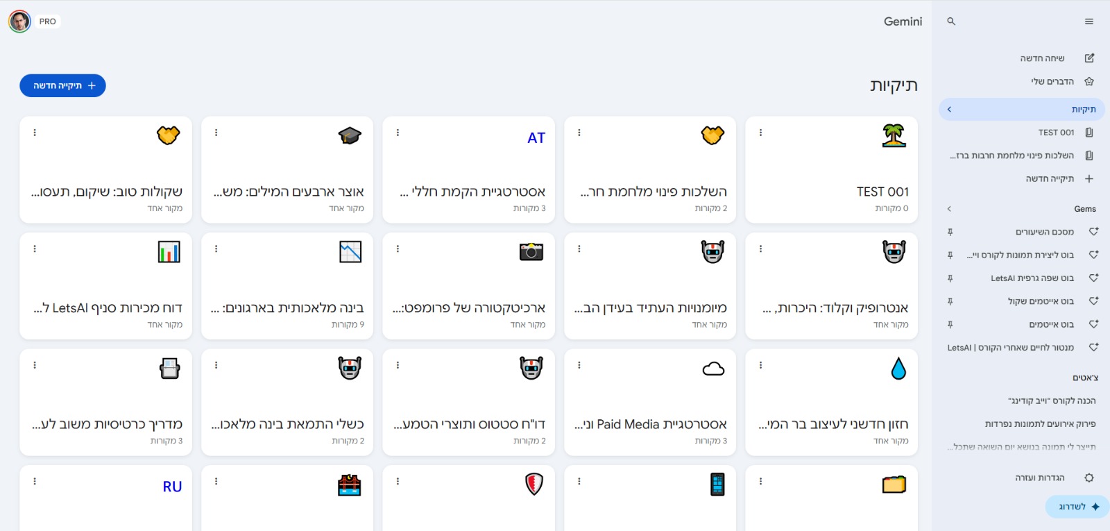 המחברת הופכת להיות מרכז הכובד של הפרויקט. לתוכה אפשר להעלות מסמכי PDF, מצגות, קבצי טקסט, הערות, קישורים ושיחות קודמות. Gemini משתמש בכל החומרים האלה כדי לענות בצורה מדויקת יותר, להבין הקשר, להציע רעיונות ולהמשיך עבודה שהתחלתם בעבר.
