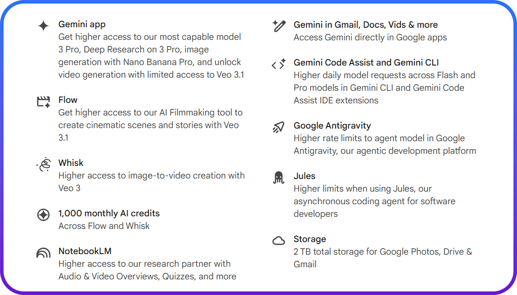 החבילה כוללת בין היתר גישה מתקדמת לאפליקציית Gemini עם מודל Gemini 3 Pro שהדהים את העולם, יכולות Deep Research, יצירת תמונות עם ננו בננה פרו (Nano Banana Pro), וגם גישה מוגבלת ליצירת וידאו באמצעות Veo 3.1. בנוסף לכך נכללים כלים כמו Flow – פלטפורמת יצירת ועריכת תמונות וסרטונים ייעודית של גוגל, Whisk ליצירת וידאו מתמונות, NotebookLM – כלי מדהים למחקר עם סיכומי אודיו ווידאו, שמאפשר גם ליצור מצגות בקליק, אינפוגרפיקות וניתוח דאטה בקונטקסט גדול.