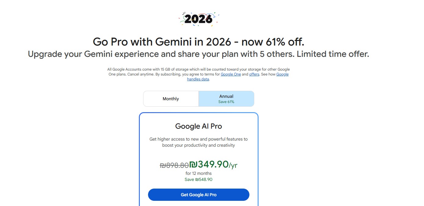 את ההטבה הזו לא תרצו לפספס! גוגל פותחים את 2026 עם 61% הנחה על ג’מיניי (Gemini) – הנחה משמעותית על מנוי Google AI Pro, כחלק מחבילת Google One. מדובר במבצע מוגבל בזמן, שמיועד למשתמשים חדשים בלבד, ומאפשר לבחור בין התחייבות שנתית משתלמת במיוחד (חיסכון של כ-550 ₪) לבין מסלול חודשי מוזל וקצר יותר למי שמעדיף גמישות.