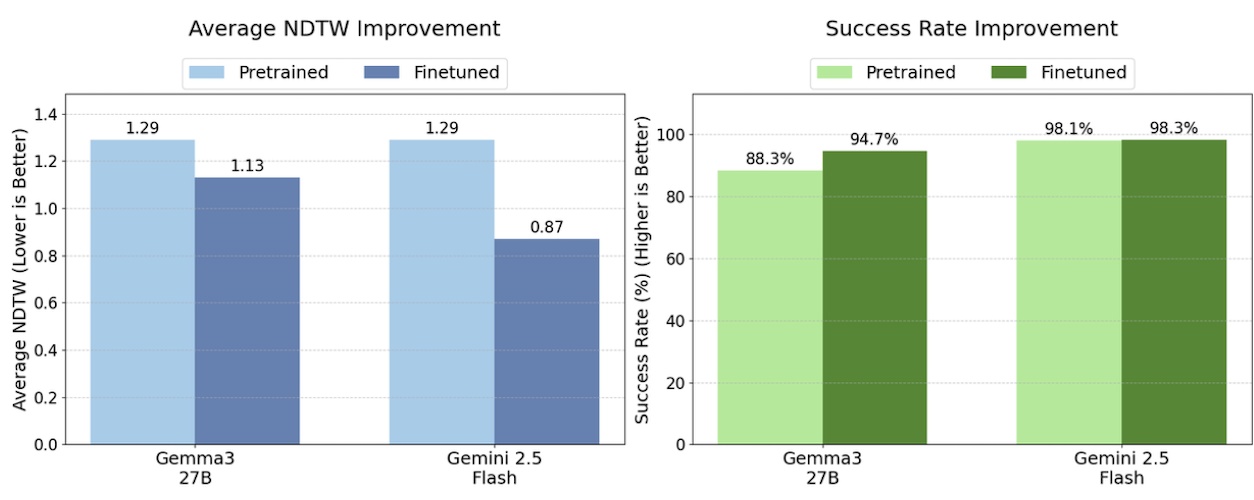 כדי לבדוק אם המערכת אכן מלמדת מודלים להבין מרחב, החוקרים אימנו כמה מודלים על תת קבוצה של הדאטה, 23,000 מסלולים, ובחנו אותם על MapBench, אוסף מפות אמיתיות שהמודלים לא נחשפו אליו קודם. התוצאות היו חד משמעיות: Gemini 2.5 Flash ירד במדד NDTW מ-1.29 ל-0.87, ו-Gemma 3 27B ירד מ-1.29 ל-1.13.