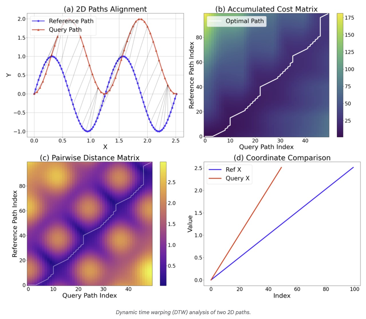 לפי גוגל, החישוב כולל ארבעה מרכיבים מרכזיים: יישור דו ממדי של שני המסלולים, מטריצת עלות מצטברת שמראה את המחיר של כל התאמה, מטריצת מרחקים זוגיים שמציגה את המרחק בין כל נקודה לנקודה, והשוואת קואורדינטות שמדגישה את בעיית ההיסט הזמני בין המסלולים. ככל שהמדד נמוך יותר, כך המסלול שחזה המודל קרוב יותר למסלול האמת.