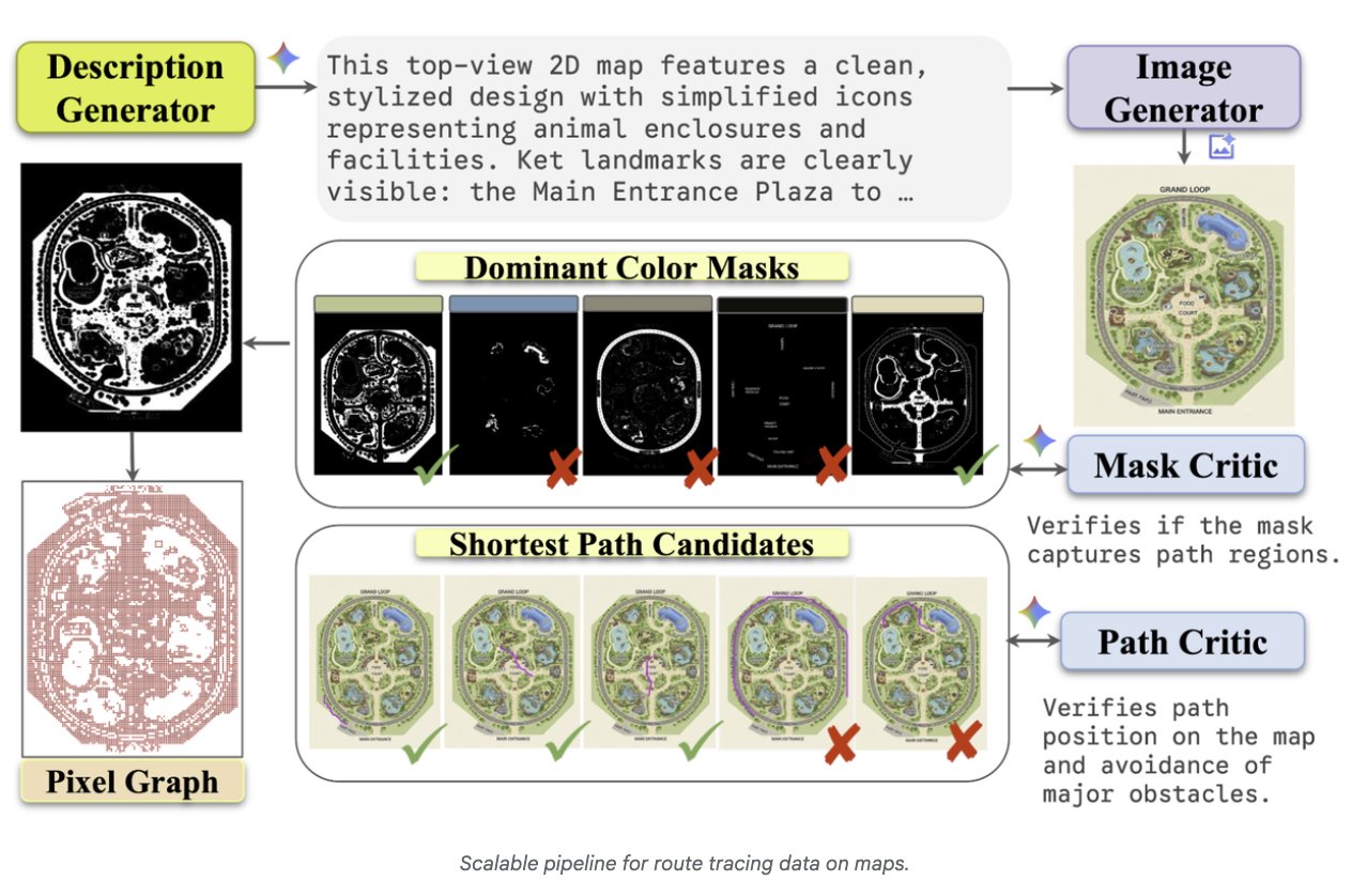 כדי להתגבר על מחסור בדאטה מסומן, גוגל פיתחה את MapTrace, מערכת אוטומטית שמייצרת מפות מלאכותיות, מזהה בהן אזורי הליכה, בונה גרף ניווט ומפיקה מסלולים תקפים. הכול נעשה ללא מגע יד אדם, במבנה שמזכיר פס ייצור: כל שלב מספק את חומר הגלם לשלב הבא, ומודלים שונים משמשים בו זמנית כיצרנים וכמבקרים.