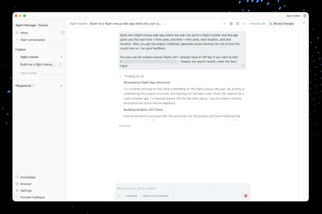 אתם רוצים לבנות אפליקציה שמאפשרת למשתמשים לחפש טיסות ולהוסיף אותן ליומן Google שלהם. במקום לכתוב את כל הקוד בעצמכם, אתם פשוט אומרים ל-anti-gravity: “בנה לי אפליקציה ב-Next.js שבה משתמש יכול להזין מספר טיסה, והאפליקציה תציג את זמן ההמראה, הנחיתה, אזורי הזמן והמיקומים. בשלב זה, תשתמש ב-Mock API.”