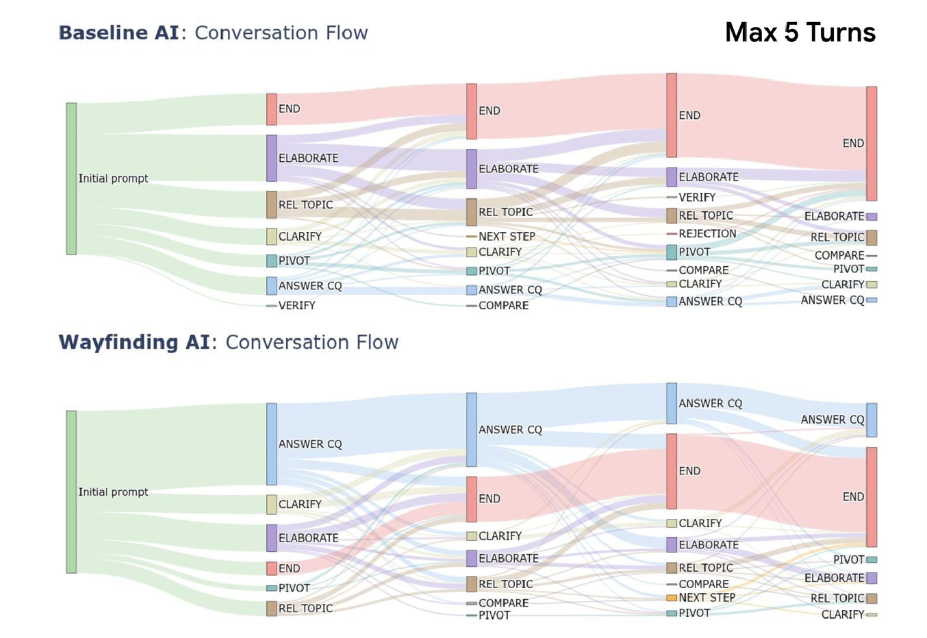 בתרשים הבא ניתן לראות את זרימת הדיאלוגים עם שני סוגי המודלים – הצ’אטבוט הבסיסי לעומת Wayfinding AI. הכחול מסמן את התשובות לשאלות הבהרה, שלב שהתרחש בתדירות גבוהה הרבה יותר בשיחות עם Wayfinding AI: