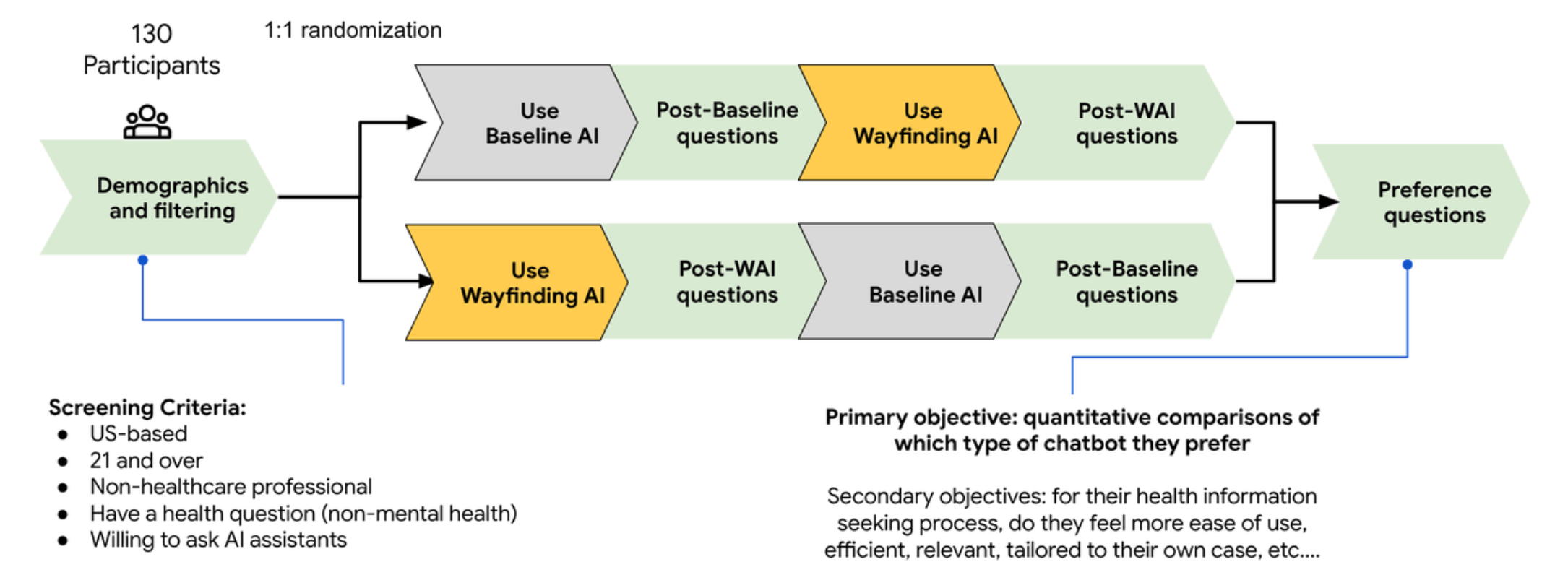 Google בחנה את Wayfinding AI בקרב 130 משתתפים אמריקאים בני 21 ומעלה, שאינם אנשי מקצוע בתחום הבריאות. כל משתתף התבקש להשתמש הן במערכת החדשה והן בגרסה הרגילה של Gemini כדי לחקור שאלה רפואית אמיתית שמעסיקה אותו, החל מכאבי צלעות וורטיגו, ועד עלייה מסתורית במשקל או טינטון.