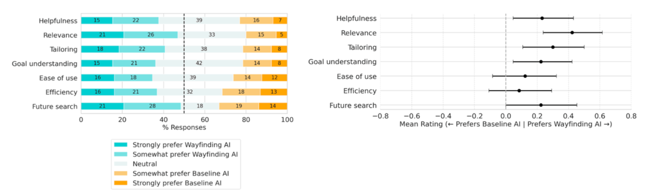 התוצאות היו חד-משמעיות – המשתתפים העדיפו את Wayfinding AI כמעט בכל פרמטר, מתועלת ורלוונטיות, דרך התאמה אישית והבנת מטרות המשתמש, ועד נוחות השימוש והיעילות.