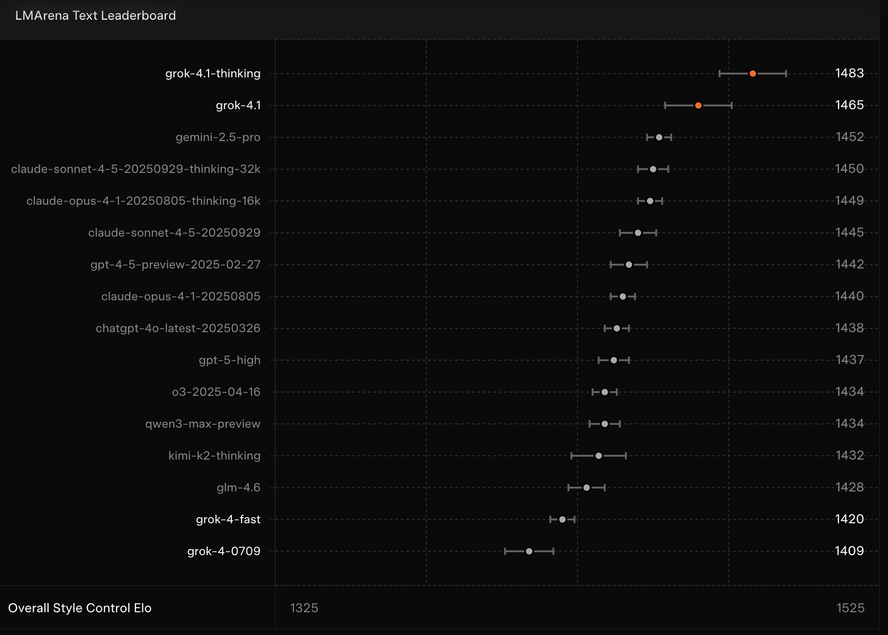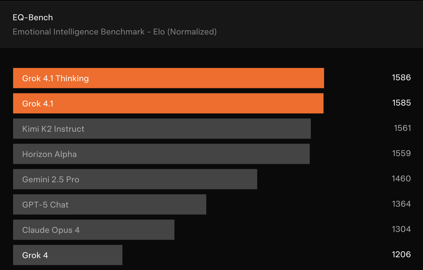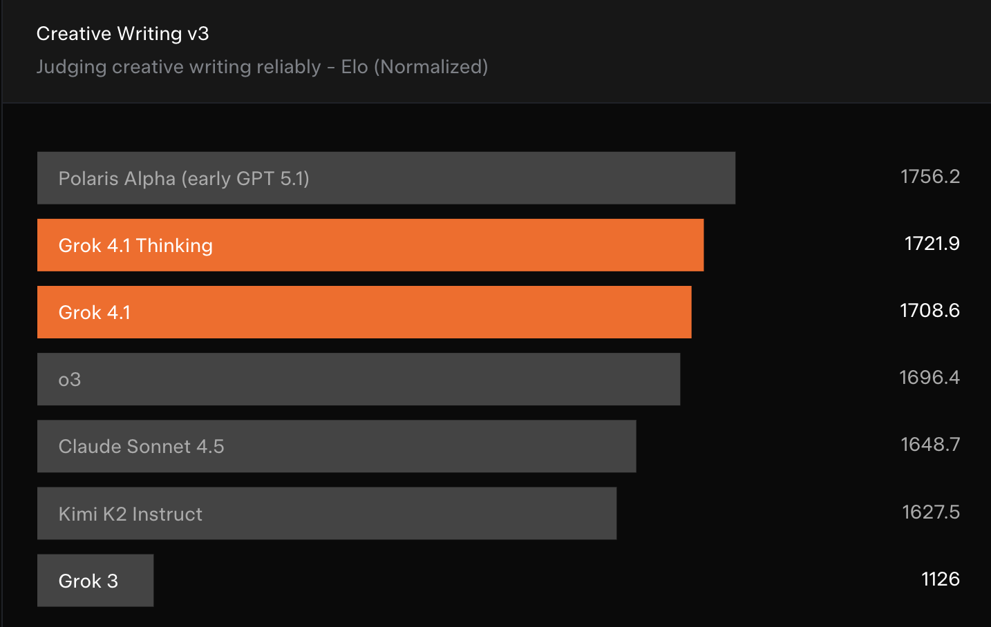 Grok 4.1 מציג רצף הישגים שנראים מרשימים על הנייר. הוא מגיע למקום הראשון בקטגוריית החשיבה של LMArena, חוצה ציון של 1700 במבחני הכתיבה היצירתית ומראה זינוק בולט במבחני האינטליגנציה הרגשית. כל אלה מציבים אותו לצד המודלים המובילים כיום.