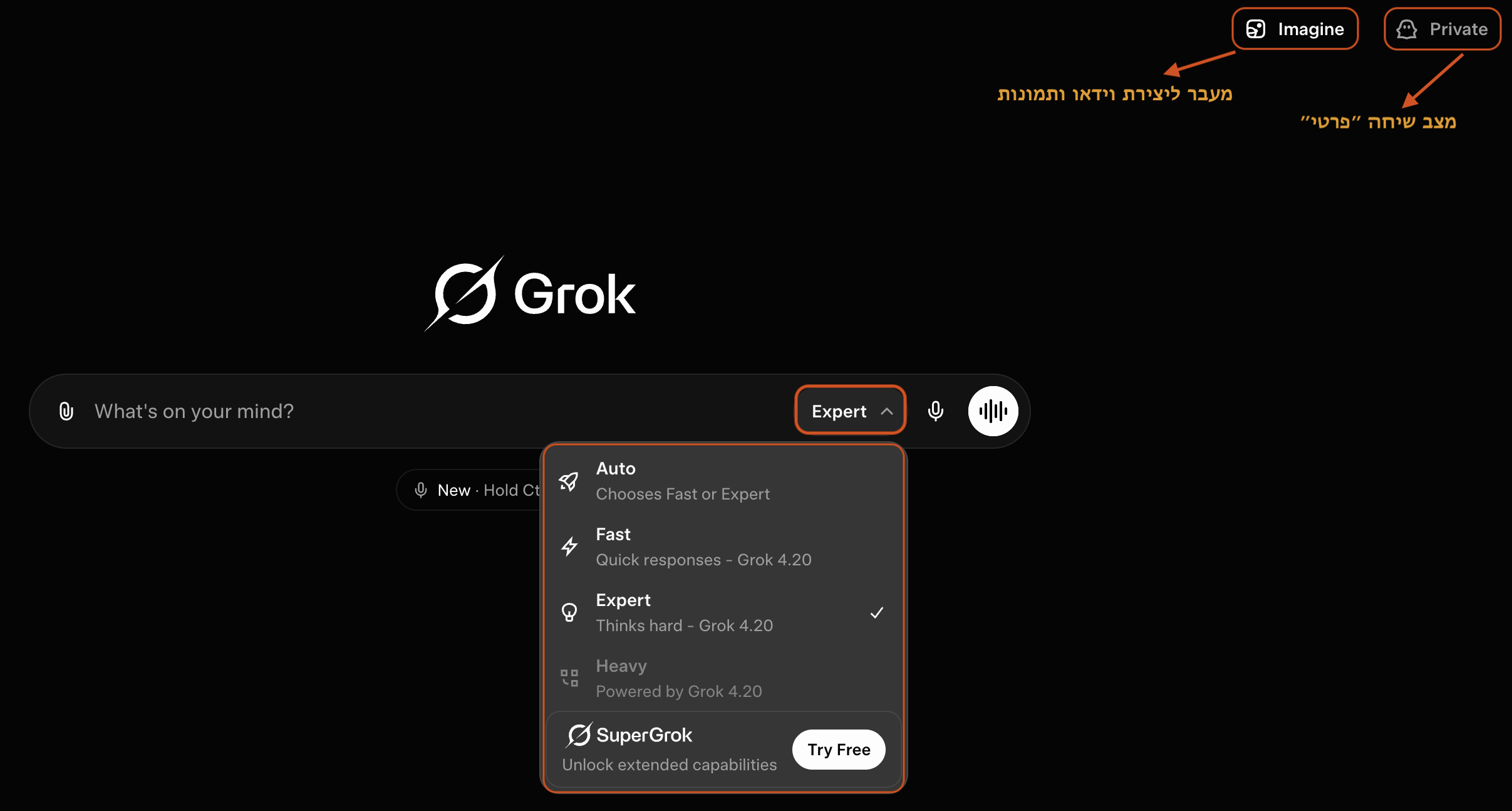 בחלק הימני העליון בתמונה המצורפת מעלה תוכלו לגלות עוד אפשרויות בממשק המשתמש הראשי. אפשר ללחוץ על כפתור Imagine שמעביר למסך יצירת תמונות ו-וידאו ואפילו לעבור למצב ״אינקוגניטו״ - שיחה זמנית שבה Grok לא שומר את ההודעות שלכם ולא משתמש בהן כדי לבנות הקשר לשיחות עתידיות. ברגע שסוגרים את החלון, השיחה נעלמת מההיסטוריה ולא מופיעה ברשימת הצ׳אטים. זה שימושי במיוחד כשעובדים על נושא רגיש, כשלא רוצים שהשיחה תתערבב עם פרויקט קיים, או כשפשוט רוצים להתנסות בלי "ללכלך" את ההיסטוריה.
