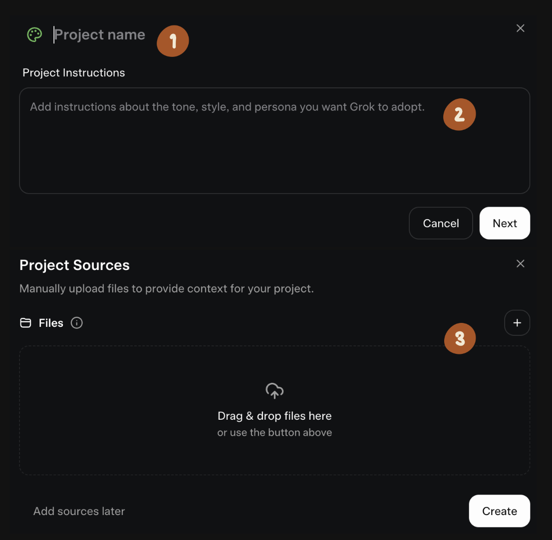 בנוסף לשיחה רגילה, Grok מאפשר לפתוח פרויקט ייעודי שבו מגדירים מראש את שם הפרויקט שלכם (1) ההנחיות, הטון והסגנון שהמודל צריך לאמץ (2). בתוך פרויקט אפשר גם להעלות קבצים, מסמכים או חומרים רלוונטיים (3), וכך ליצור סביבת עבודה קבועה שבה Grok מבין את ההקשר בלי להזכיר לו אותו בכל פעם מחדש. עבור משימות ארוכות, כתיבה מתמשכת או ניתוח של כמה מקורות מידע, פרויקט מעניק יציבות, עקביות ותוצאות מדויקות יותר.