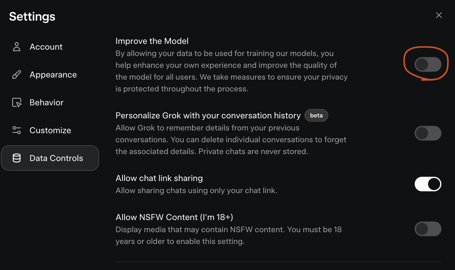 כל אחת מהאפשרויות האלה ניתנת להפעלה או כיבוי, והן משפיעות על האופן שבו Grok משתמש במידע שלכם. המדיניות עשויה להשתנות, ולכן תמיד עדיף לבדוק את ההגדרות בזמן אמת במקום להסתמך על הנחות או על מידע ישן.